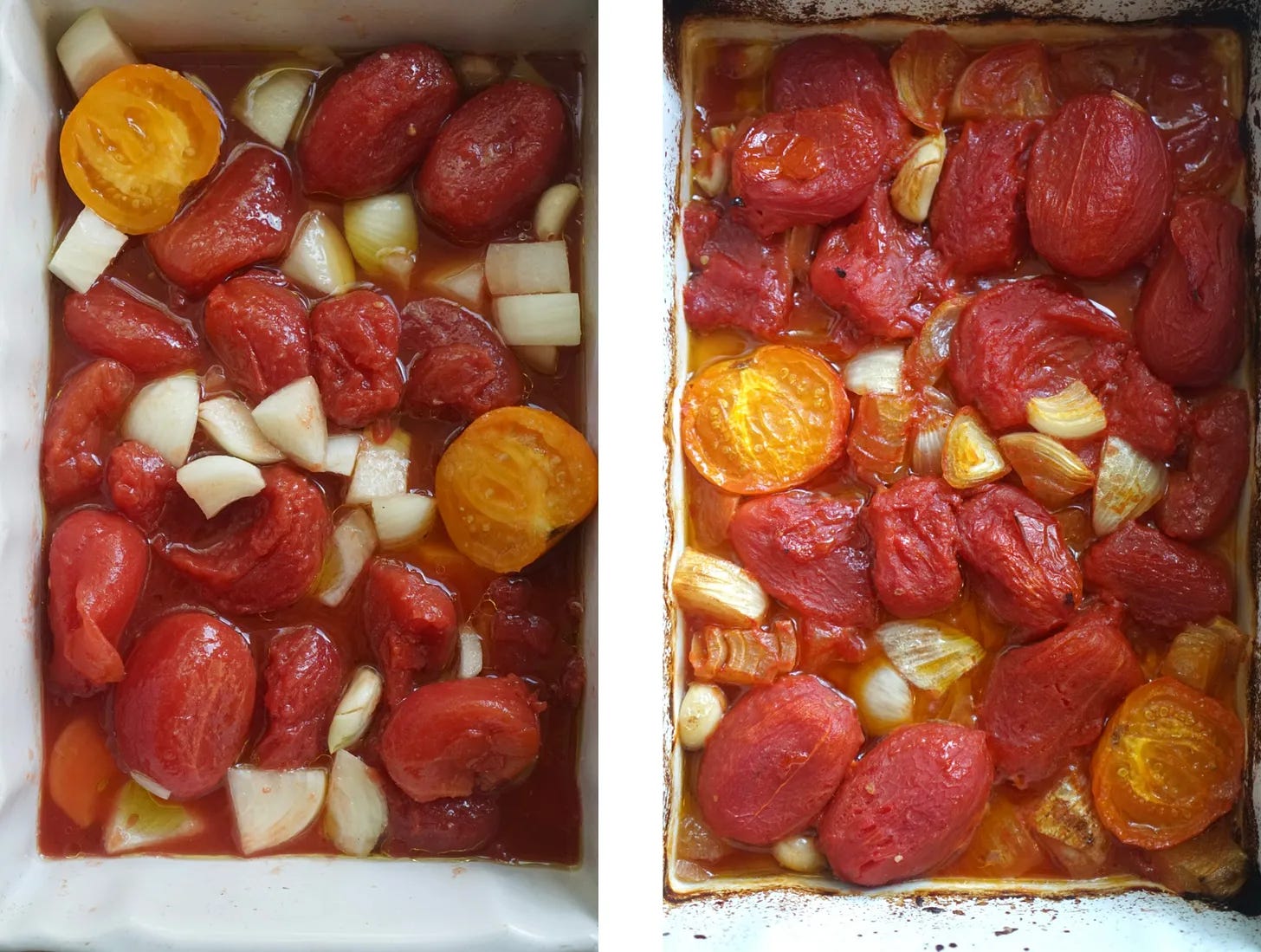 This one is so lovely in both color and texture, plus I think most everyone will always have the six (!!) ingredients on hand to make it. You simply cut up an onion and peel some garlic, adding it to a roasting dish, and dump a can of whole tomatoes on top. It all gets olive oiled and roasted into sticky, caramelized tomato perfection, then blended into a silky, orange red bowlful. Some white beans stirred through provide texture, protein and fiber.