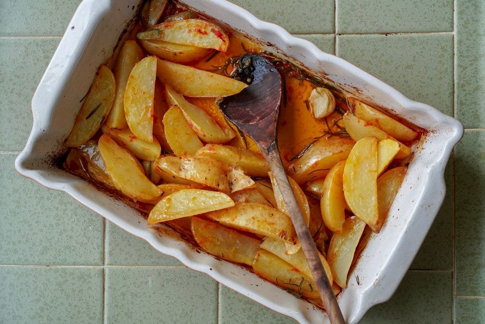 Potatoes are an often overlooked staple that are cheap, delicious, comforting, and healthful. A bag often lasts a good while in the pantry and is always on hand in our house. I love that potatoes can be creamy, crispy or both. These are both—the potatoes are par boiled to ensure even cooking and creaminess, then tossed with lots of good strong flavors—tomato, lemon, garlic, and rosemary—enveloped in olive oil for crisp edges, and tucked in the oven to roast, hands off, as an excellent dinner side.